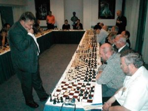 FIDE GM Vokac (CZE) takes on all comers during the simultaneous display. Lots of drawn games at 02:00 the next morning!